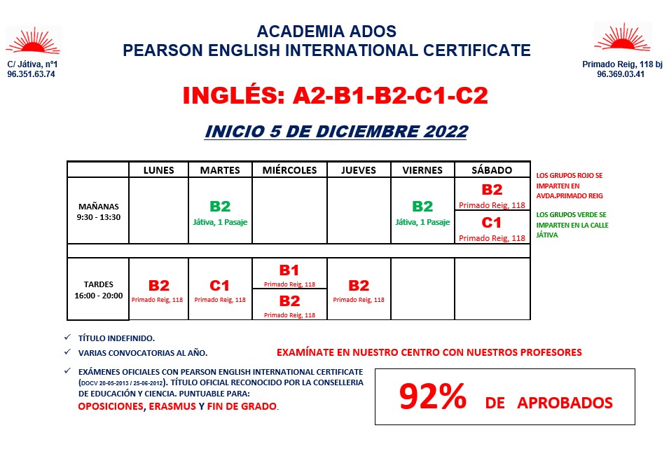 El inglés es el idioma que todas las empresas exigen ya a sus trabajadores antes incluso de seleccionarlos. La Academia Ados es un Centro Oficial de inglés B2 en Valencia en el que puedes mejorar y titular tus conocimientos de inglés de una manera sencilla, con los mejores materiales Pearson y teniendo en cuenta el contenido del examen. La prueba utiliza contenidos de la vida real y las tareas, como escribir mensajes, comprender conversaciones y artículos de prensa, o participar en una conversación son siempre una experiencia positiva para la prueba. A través de una variedad de tareas se ayudará a los estudiantes a identificar sus fortalezas pulir sus desventajas para sacar el máximo del examen.